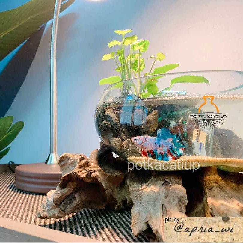 Aquarium mini cupang ikan kecil unik akuarium kaca dan kayu bulat glass wood size s bisa untuk aquascape pot vas bunga pajangan dekorasi rumah.